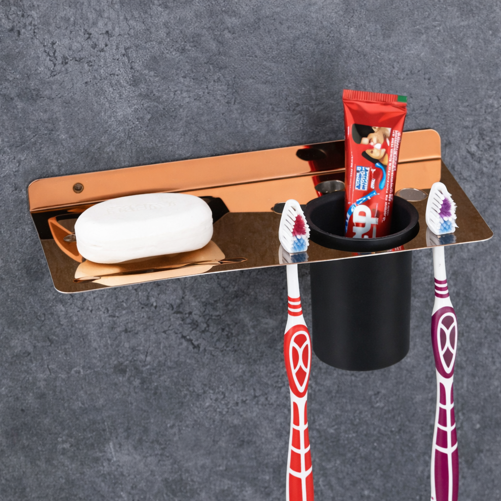 This multifunctional unit includes a soap holder and tumbler holder, making it a convenient solution for storing soap and toothbrushes in one place.